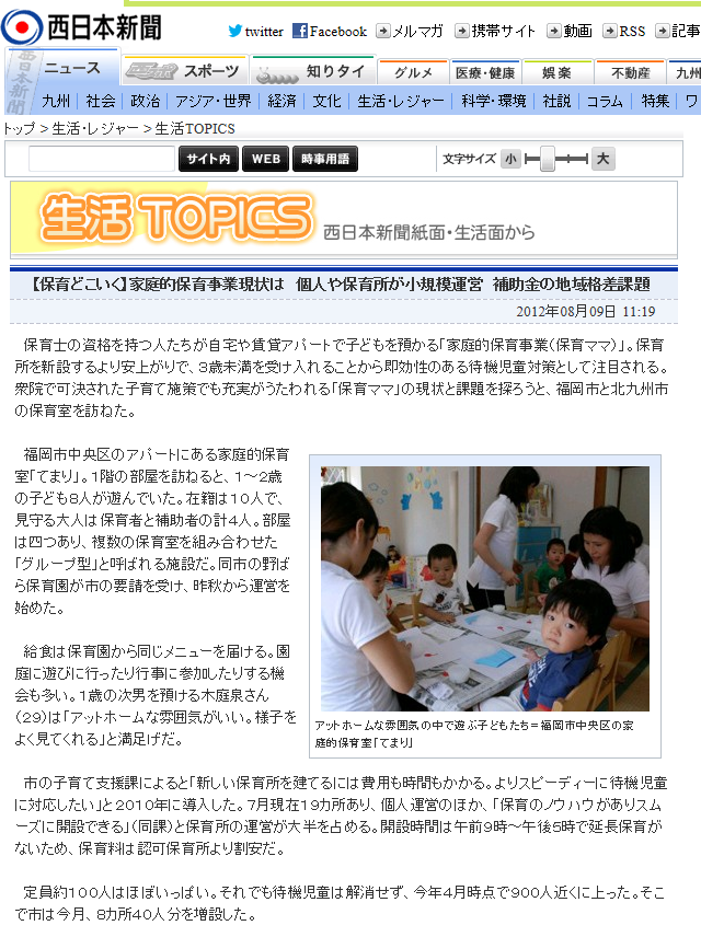 「保育士らが自宅で乳幼児保育ー保育ママ国が本腰」 |